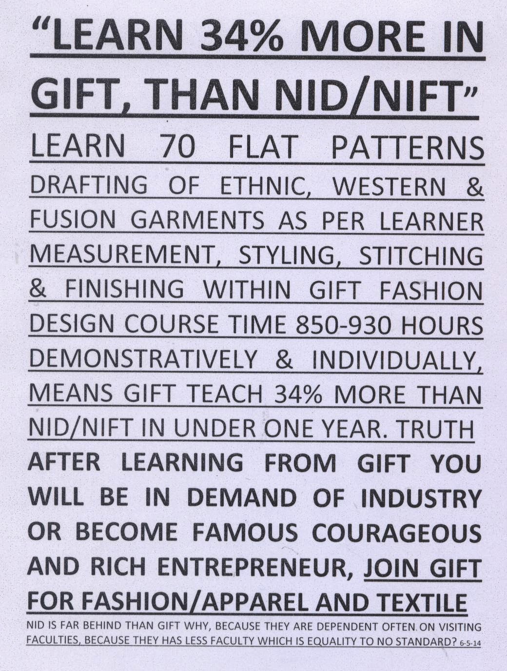BASIC “BURDEN LESS” EDUCATION OF FASHION &TEXTILE DESIGN, IS VERY, VERILY DIFFERENT THAN NID, NIFT & OTHERS. GIFT EDUCATION  IS ABOUND ACUMEN, SKILLFUL ABUNDANT, MEANINGFULLY POWERFUL IRRESISTIBLE, SMALL AND LARGE INDUSTRY ORIENTED &   SUPREME ATTRIBUTION TO GIFT   ENTREPRENEURS, WHICH NOW NID, NIFT AND OTHER DESIGN INSTITUTES CANNOT DENY.